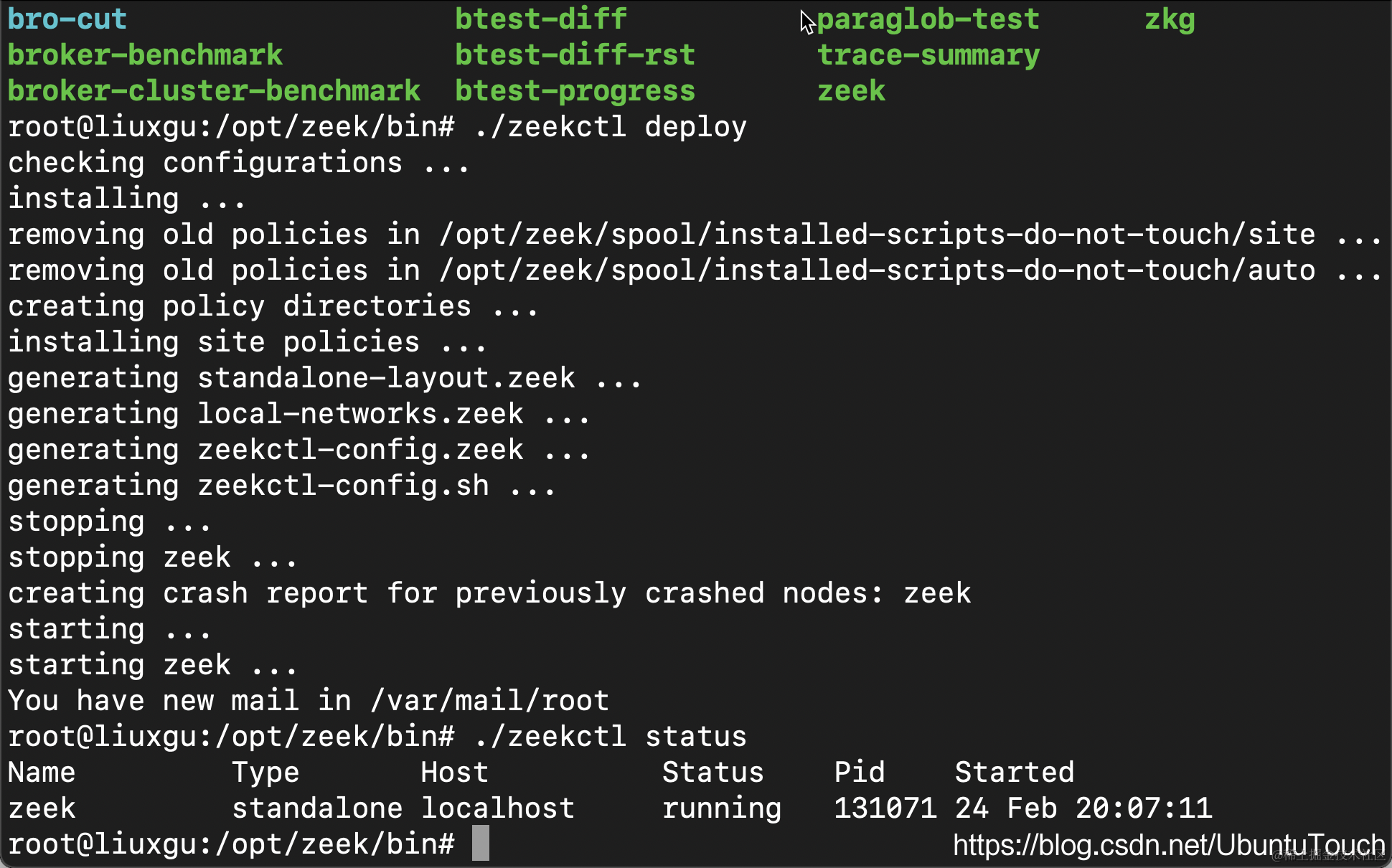 现在,我们准备运行下面的命令来部署 Zeek。我们需要在 root 账号下运行: