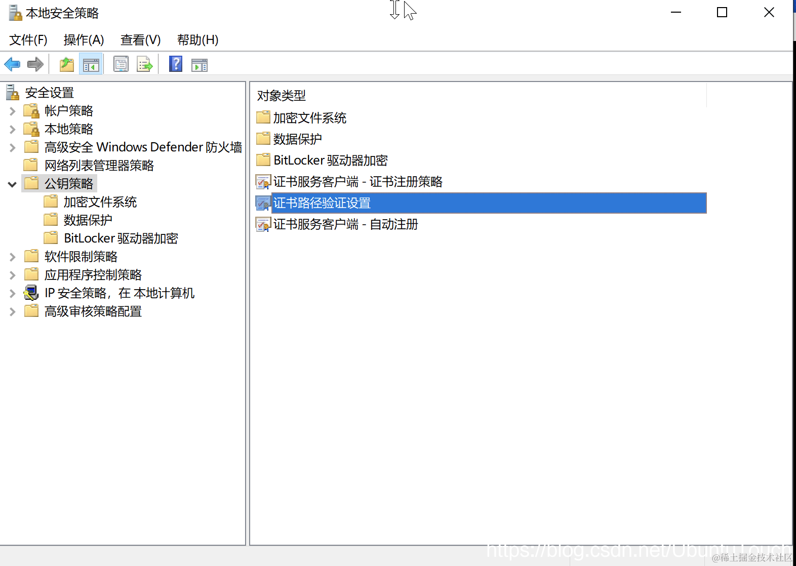 首先在 Windows 搜索栏中搜索 “本地安全策略”。 然后转到 安全设置 > 公钥策略 > 证书路径验证设置