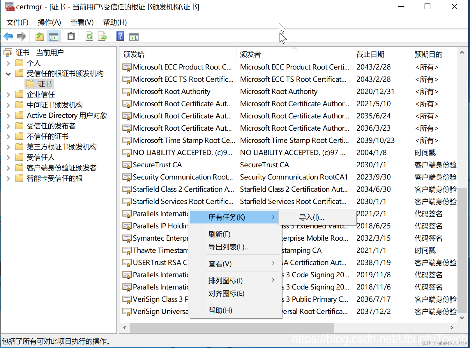 然后转到 “受信任的根证书颁发机构” > “证书”,右键单击空白处的任意位置,然后选择 “所有任务” > “导入”