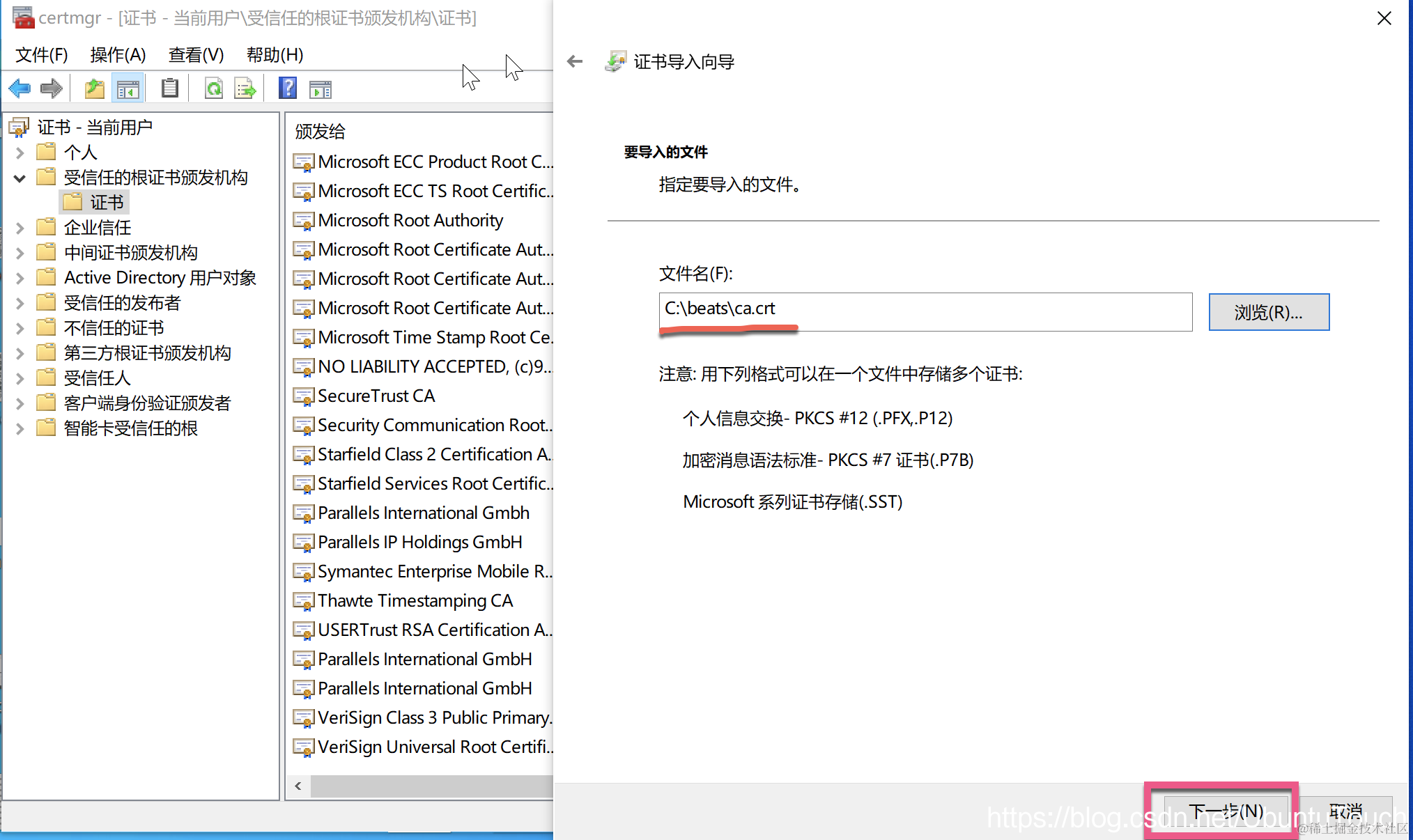 然后简单地按照向导操作,并选择我们之前创建的 ca.crt。