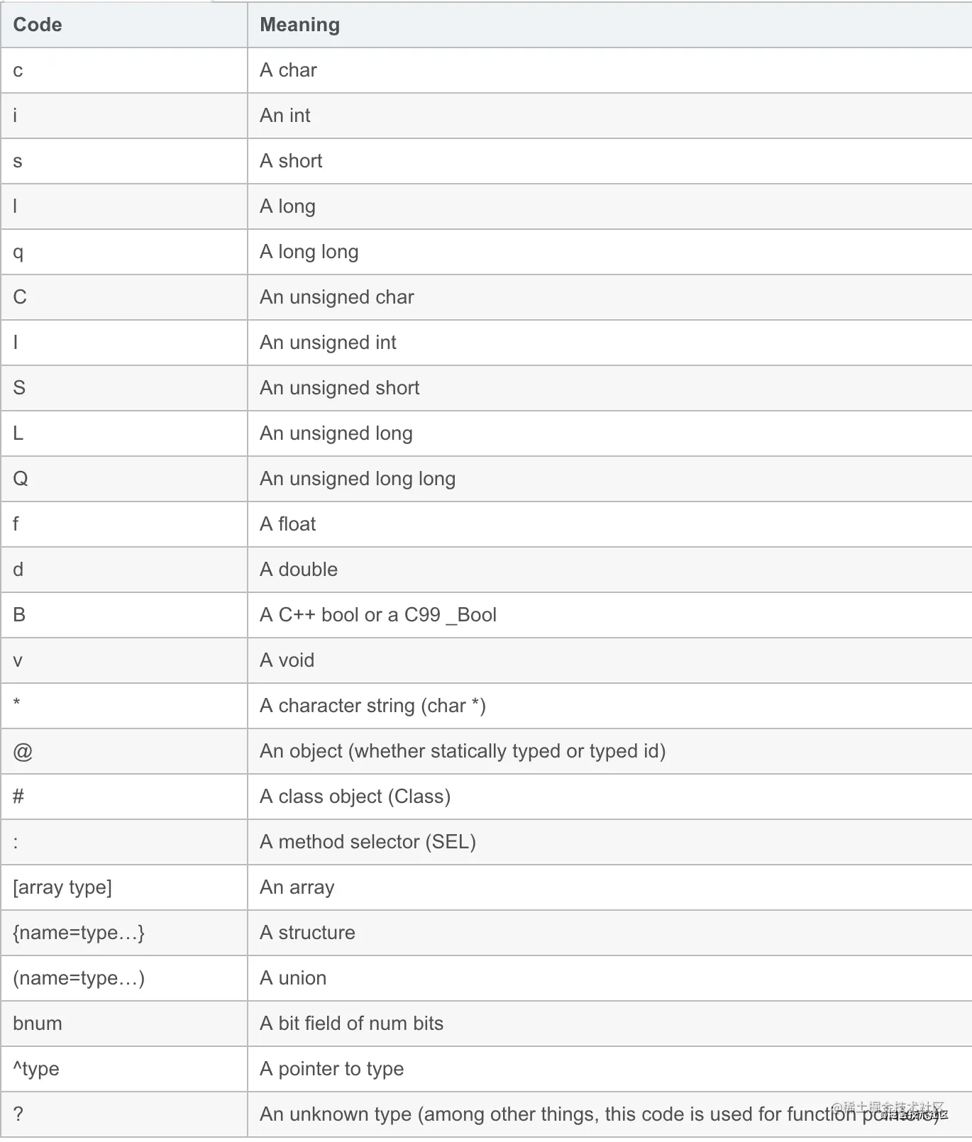 其他的setter方法一直到@和前面的都一样,均为返回值void、参数id self、参数SEL _cmd,最后一个才是我们传递的方法参数,因此可以通过该方法获取,其类型对照表如下所示: