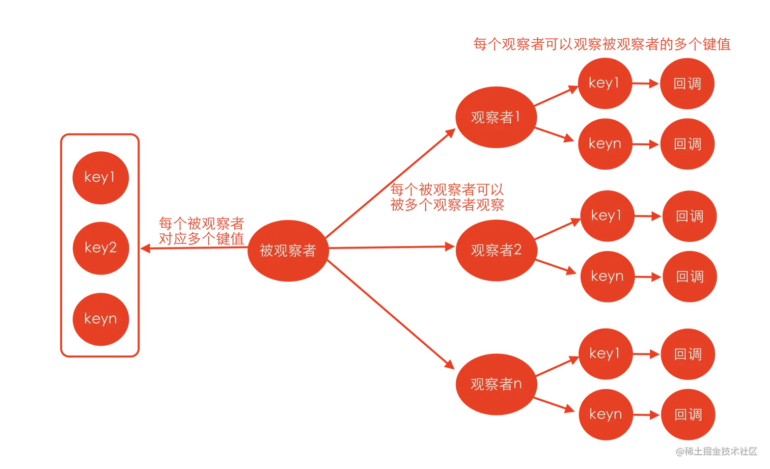 如果理解了前面FBKVOController的观察者之间的对应关系,相信很快理解自定义KVO之间的对应关系,即一个被观察者对应多个观察者