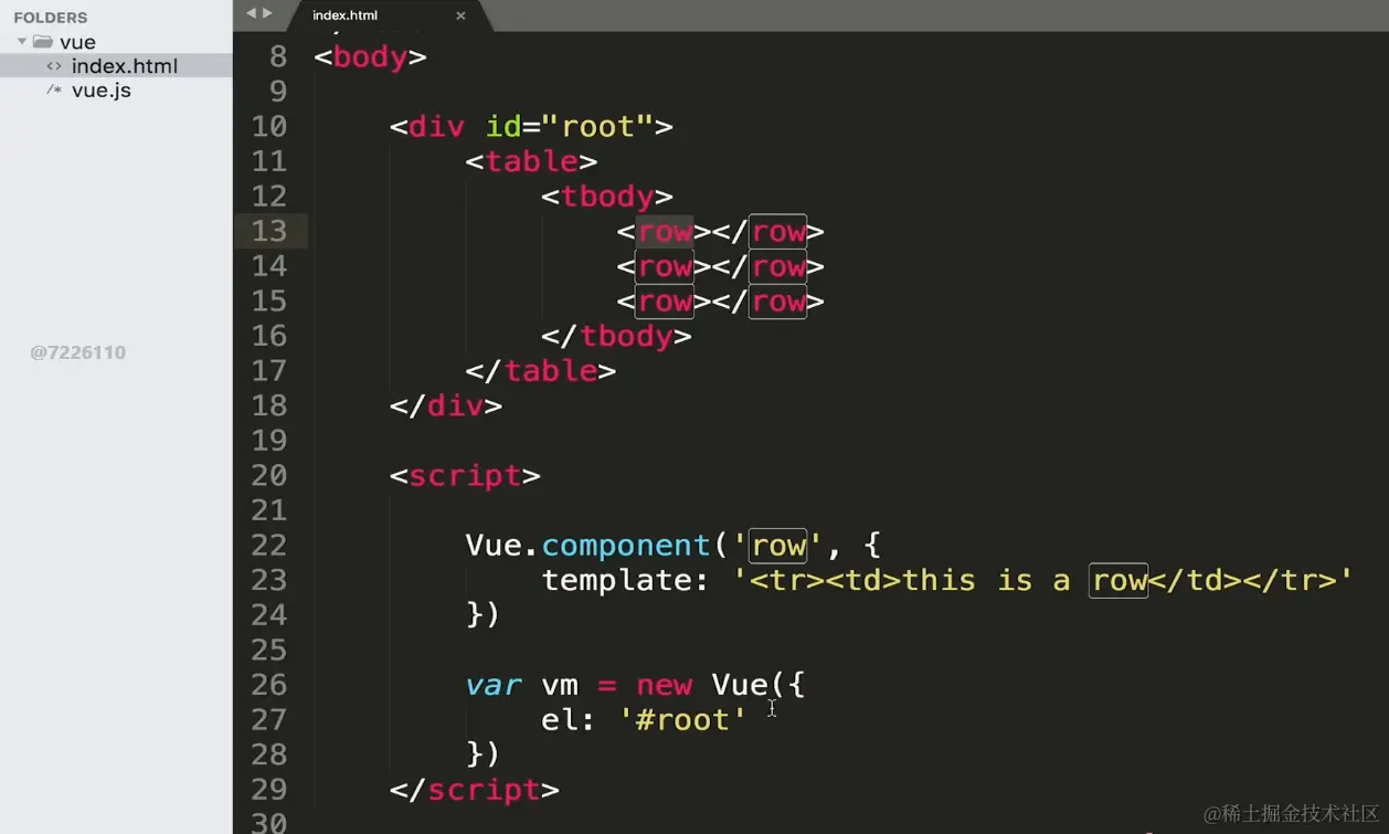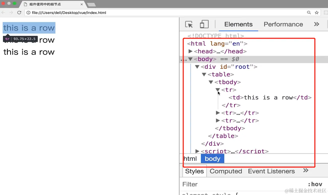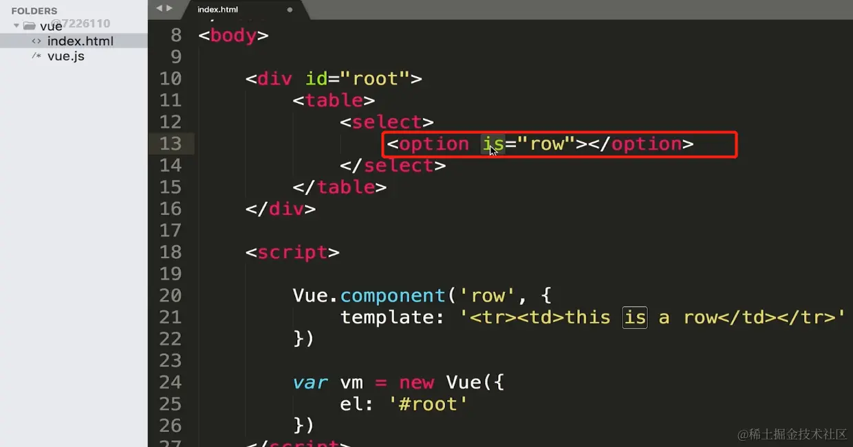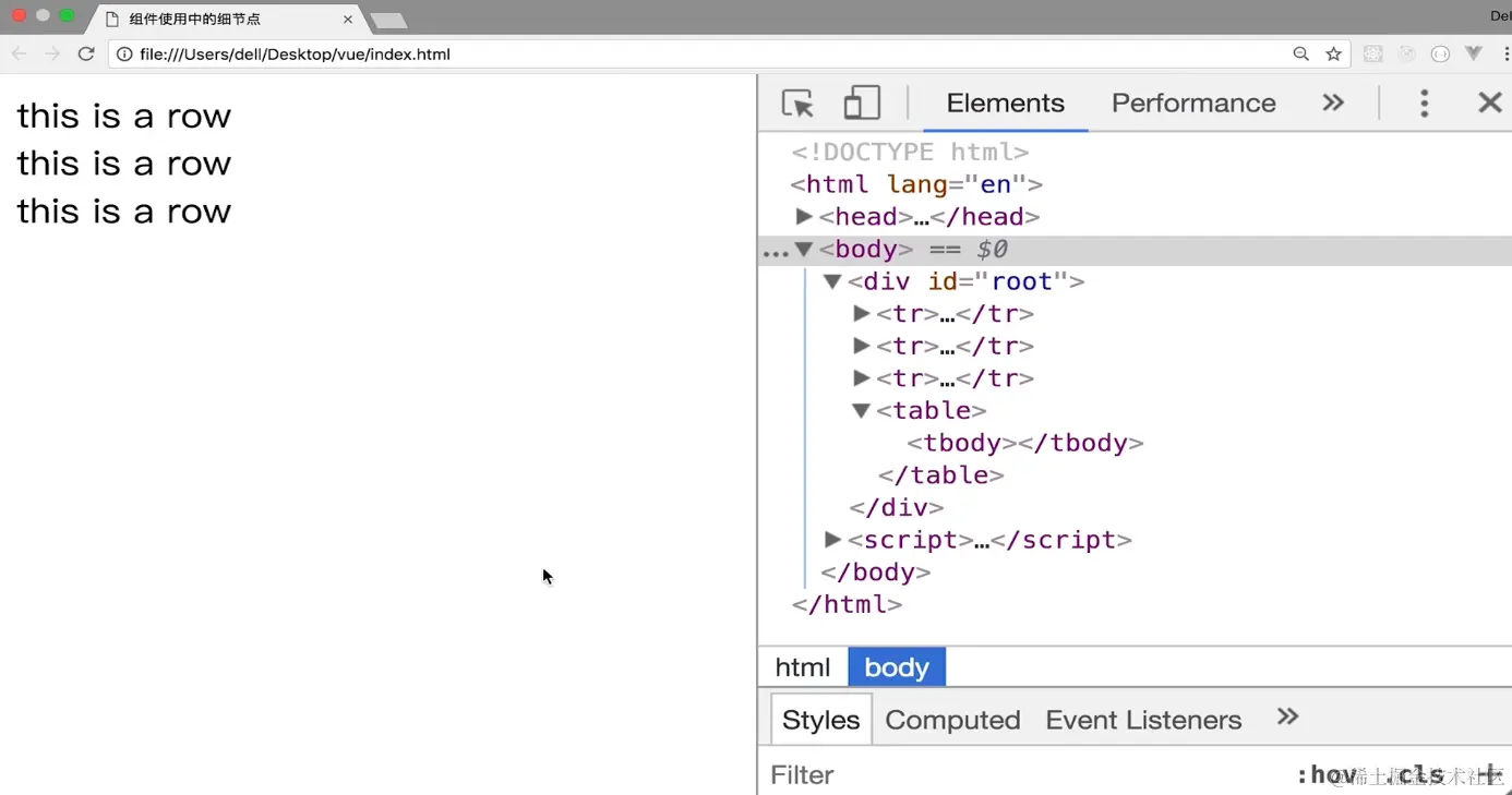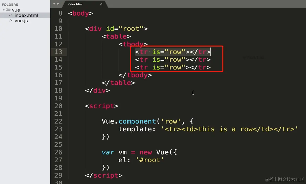 Vue使用is标签,解决标签渲染中的一些小bug 冰露农夫 2021-03-02 202 阅读1分钟 我们去显示3个row组件,设想的是table标签下是tbody标签,在下面是3个组件,但现在问题是这三个tr显示在了table标签的外部,这就是一个标签渲染的小bug 借助is属性 tbody里既然只能显示tr,那就把他们都改成tr就好,然后在tr上加is属性,赋值为row 这就实现了! 其他标签也是一样