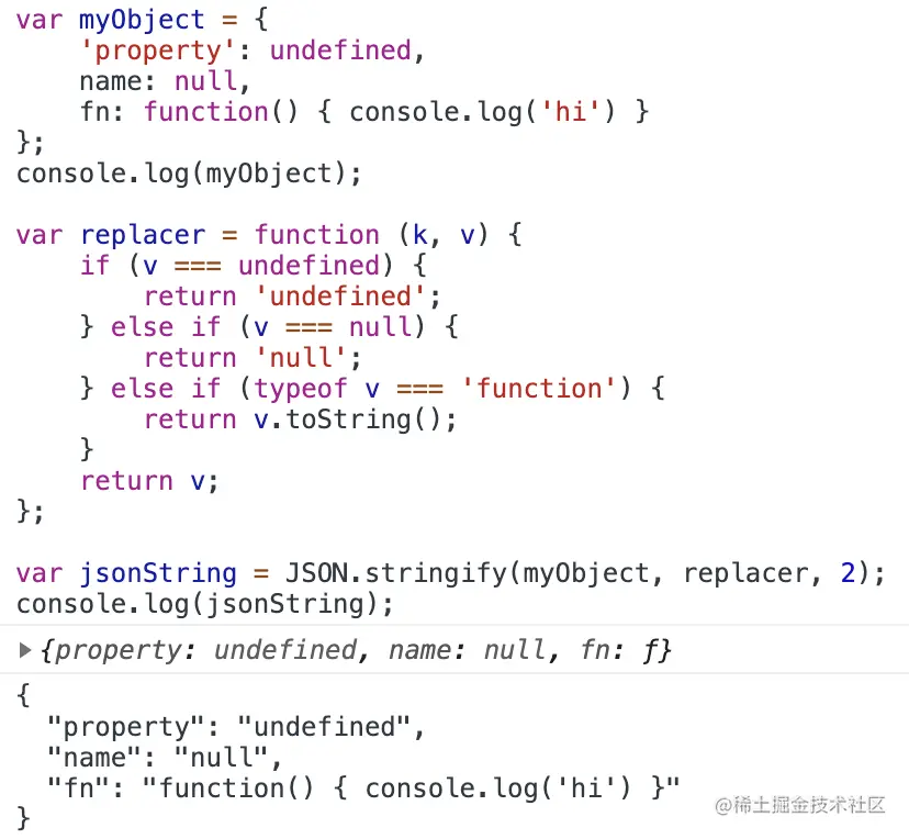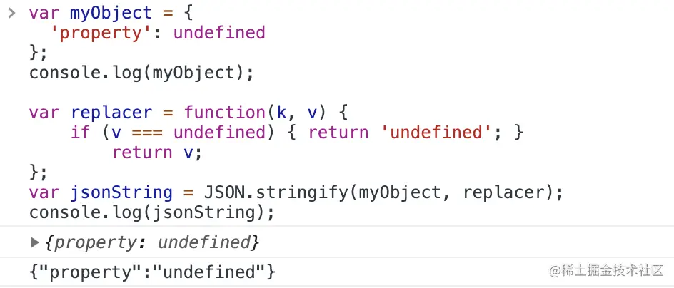 上面的代码创建了一个 replacer 函数,作用是把对象中的undefined值替换为'undefined'字符串,执行结果如图:。