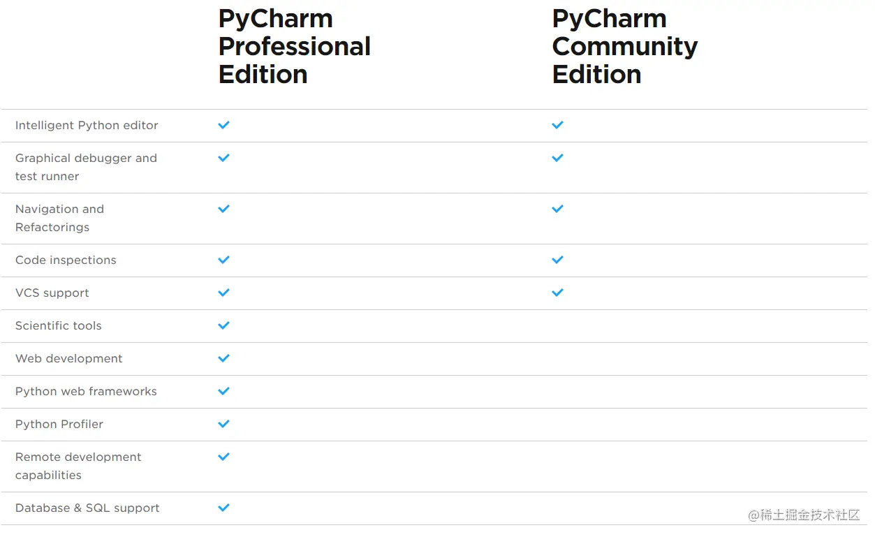 社区版和专业版在功能上有哪些区别呢?你可以看下面这个表格。