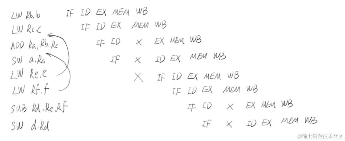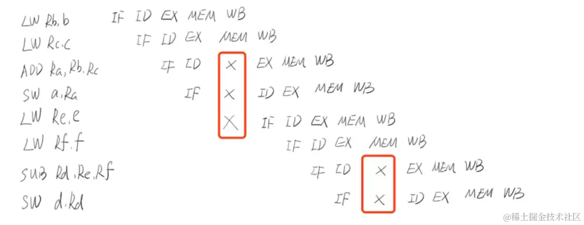 从上图可以看到有几个打x的地方,如果按照顺序执行的话,CPU是需要一个时钟周期来等待的,首先看第一个红色框的,第一个需要空出一个时钟周期是因为当前变量C还没有写入,此时是不可以进行两个值计算的,我们需要等待变量C的写入才可以进行执行两个数的求和,第二个空的时钟周期是因为当前一个时钟周期内,一个物理逻辑单位只能被一个指令执行,如果不空出一个时钟周期,那么就会与上面的EX起到冲突,第三个空档也是一样的道理。第二个红色框也是如此。