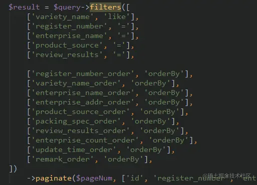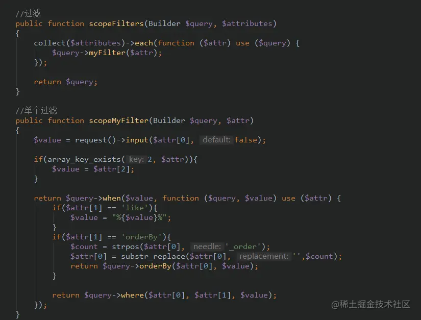 Laravel筛选条件封装 Guoo914 2021-03-02 832 阅读1分钟 因为经常有场景是首页会有各种筛选条件,要做很多的判断,判断参数然后构建查询条件,如果多筛选条件的话,很快就会写的很冗余很乱。 为了解决这个问题,我利用laravel的本地作用域,封装了一个自动构建查询条件的本地作用域。 他会自动判断有无参数,如果有这个参数则获取参数的值,并且构建一个where查询构造器,然后返回构造器实例。