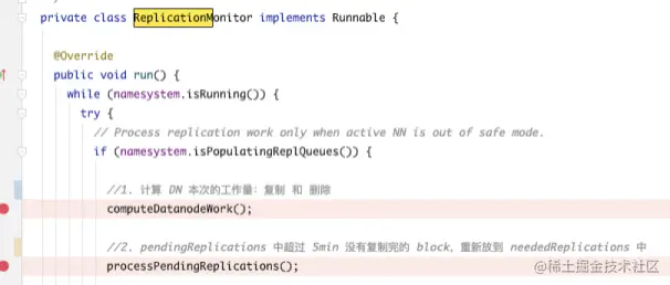 neededReplications 和 pendingReplications 这个类比较核心,NN 有一个 ReplicationMonitor 线程,用于处理「副本恢复」和「冗余删除」,其中「副本恢复」逻辑,就是围绕着这 2 个类进行的。