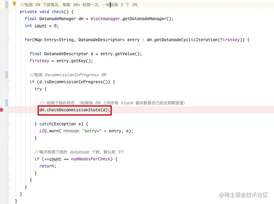 DecommissionManager 维护了一个 Monitor 线程,默认每隔 30s 检测一次,一轮检查 5 个 DN。