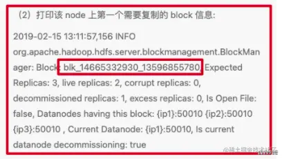 2019-02-15 13:11:57,156 INFO org.apache.hadoop.hdfs.server.blockmanagement.BlockManager: Block: blk_14665332930_13596855780, Expected Replicas: 3, live replicas: 2, corrupt replicas: 0, decommissioned replicas: 1, excess replicas: 0, Is Open File: false, Datanodes having this block: {ip1}:50010 {ip2}:50010 {ip3}:50010 , Current Datanode: {ip1}:50010, Is current datanode decommissioning: true