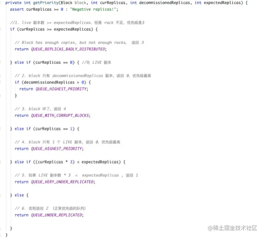 6.liveReplicas 是指非 corrupt,非 excess,非 decommissioned 的节点(实际副本数不会变化,因为 node 处于 decommission 状态,所以 liveReplicas 会比期望副本数小,触发后面的「副本检测线程」执行块的复制)
