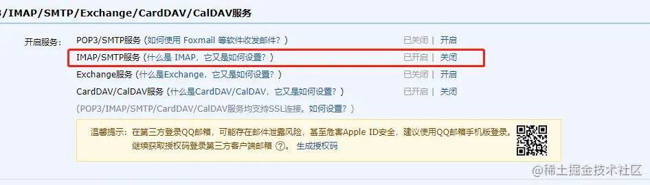 找到如下图红框所示,开启IMAP/SMTP服务后,就可以随机获取授权码了。