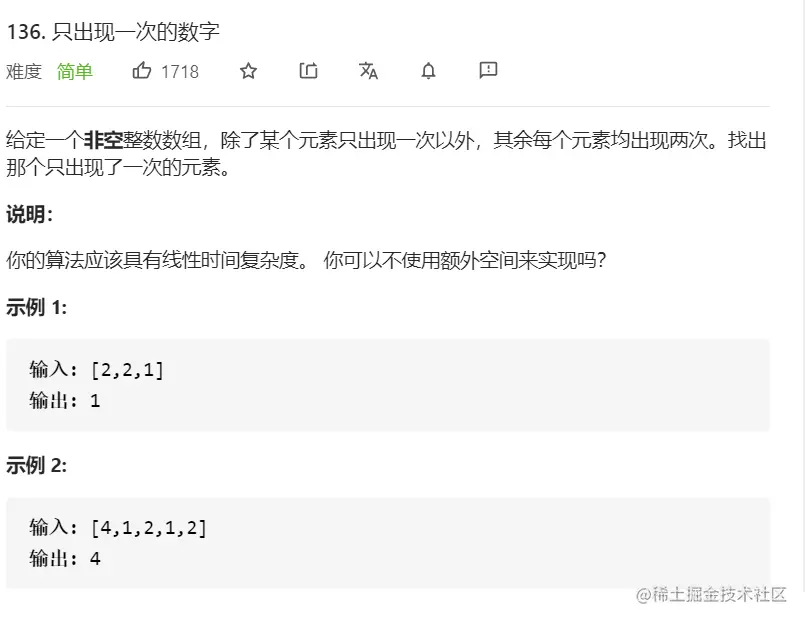 位运算也是个高频考点,这是位运算的最简单应用,异或,由于两个相同的数异或为0,所以可以用异或实现我们的需求。