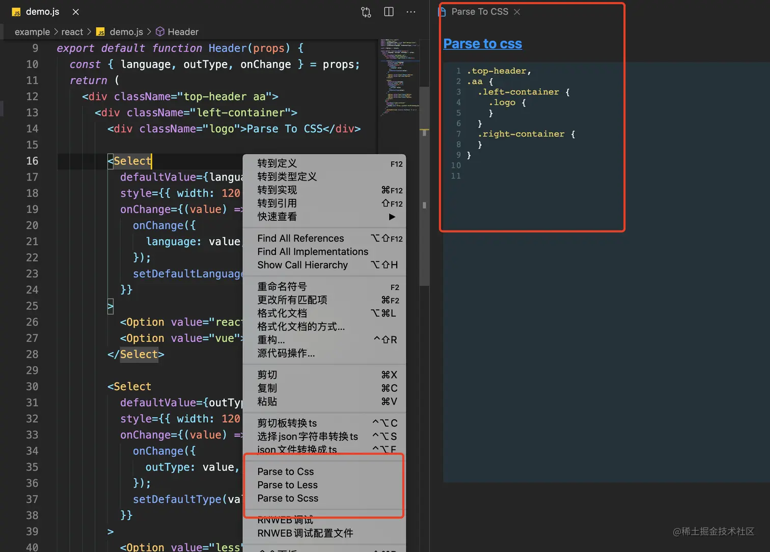 使用此插件很简单,只需要在 vscode 的插件市场中搜索parse-to-css-vscode-plugin,在需要转换的文件(vue/jsx/tsx/js)文件中右键选择对应功能即可。