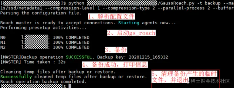 整个备份流程的上层代码为python代码,即GaussRoach.py,master进程的创建和agent进程的拉起都是由python侧完成的。备份的配置和参数部分检查过程同样是由python侧代码完成。各个节点agent进程被拉起之后,C侧代码进行具体的业务操作。C侧代码运行起来之后,可以通过ps ux到gs_roach进程查看进程状态。