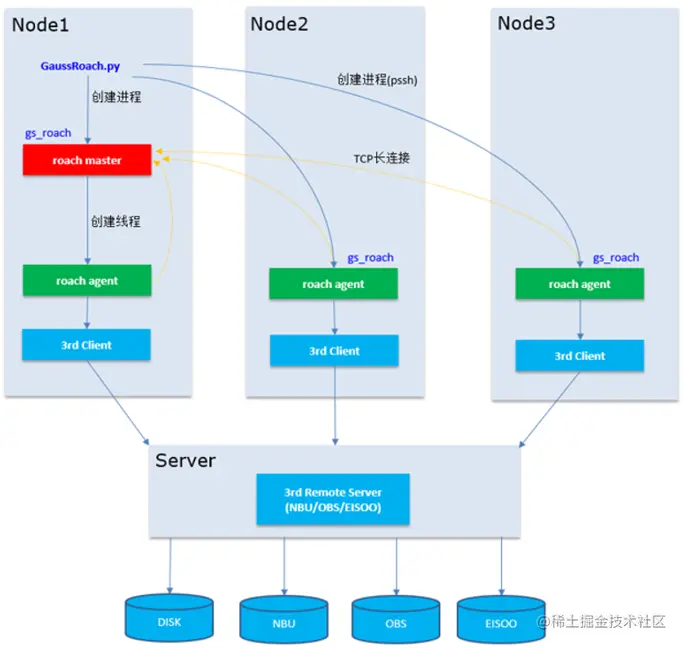 任意节点均可作为主节点拉起GaussRoach.py,然后每个节点都启动gs_roach进程负责本节点备份,各节点并行备份,节点内各DN并行备份。