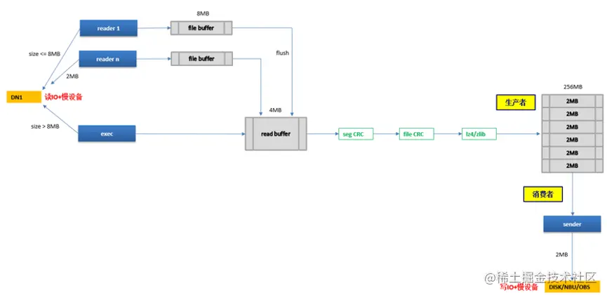 Roach备份采用生产者-消费者模式,下图展现了备份流程各个线程及IO交互图。exec线程作为生产者,同时为减轻exec线程的压力,增加并行的reader线程读取小文件;sender线程作为消费者;中间则是通过一个256MB(可设置)的大buffer衔接。