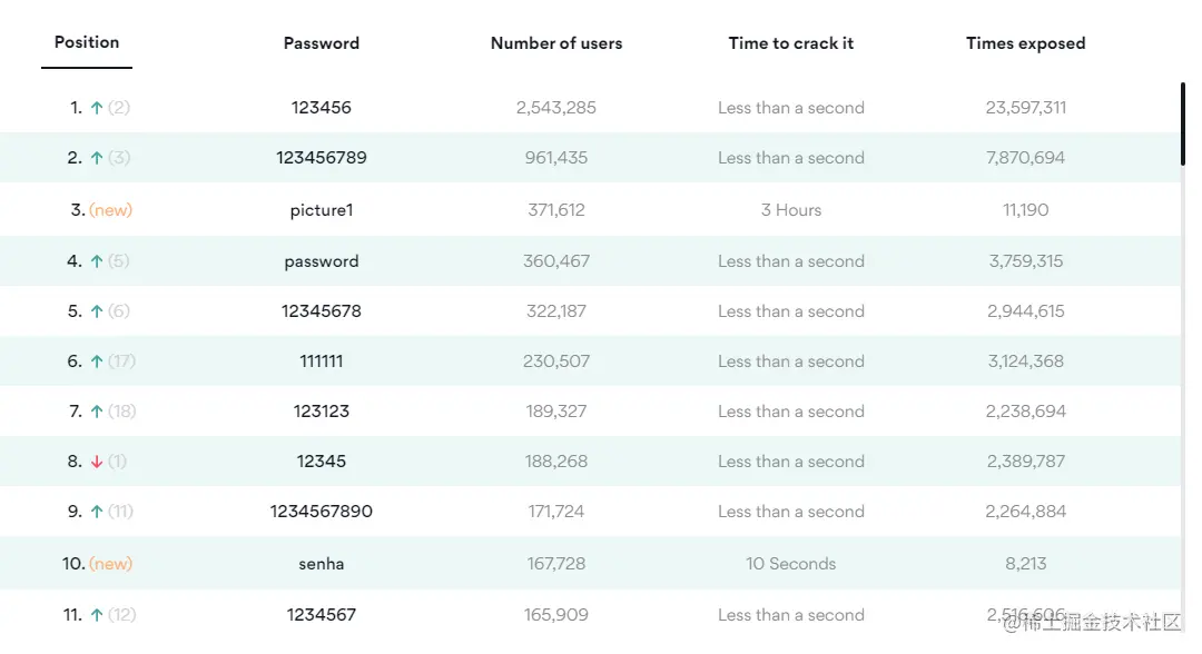 在 2020 年末,NordPass 公布了 2020 年使用率最高的 200 个密码,排名靠前的几个密码分别为 123456、123456789、password、12345678、111111、123123、12345、1234567890、1234567、000000、1234 …… 除了纯数字,还有各种数字和字母组合,例如:qwerty、abc123 和 picture1 等等。