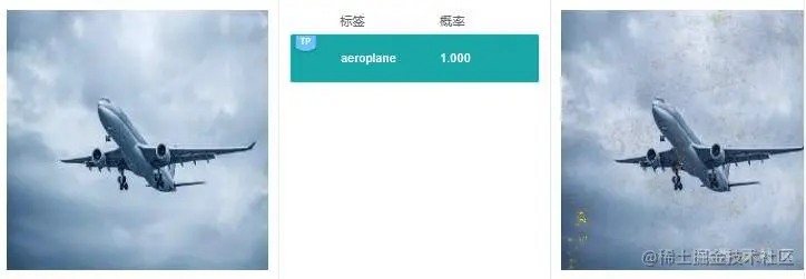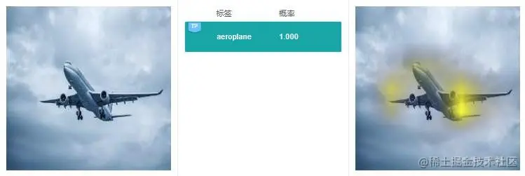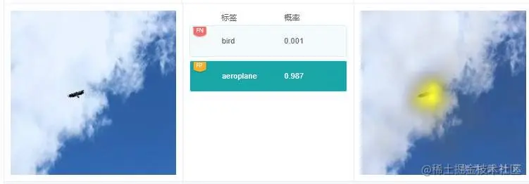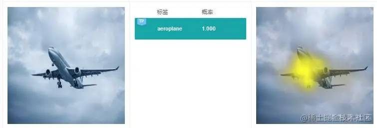 例7.3.2:图中有一个分类预测结果是“aeroplane”,但图中并没有飞机。从标签“aeroplane”的解释结果看,高亮区域在鹰的身上。打开飞机相关的训练数据子集,发现很多情况下训练图片中飞机都是远处目标,与老鹰展翅滑翔很像,猜测可能是这种原因导致模型推理的时候,误将老鹰当做飞机了。模型优化的时候,可以考虑增加老鹰滑翔的图片比例,提升模型的区分和辨别能力,提高分类准确率。