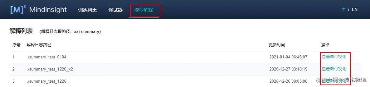 启动MindInsight系统,在顶部选择进入“模型解释”模块。可以看到所有的解释日志路径,当日志满足条件时,操作列会有“显著图可视化”的功能入口。
