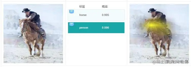 例7.2.1:原图中,有人,在预测标签中有1个标签是“person”,这个结果是对的;但是选择“person”标签,在查看右边解释的时候,可以看到高亮区域在马头上,那么这个关键特征依据很可能是错误的。