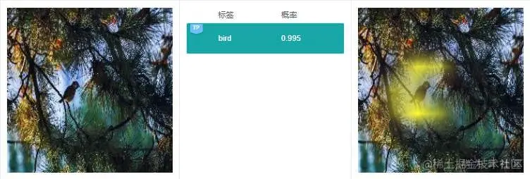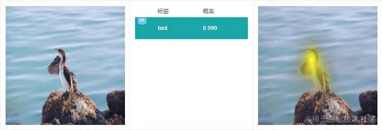 例7.1.1:上图预测标签是“bird”,右边给出依据的关键特征在鸟身上,说明这个分类判断依据是合理的。