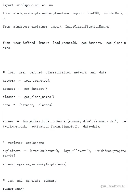 下面以ResNet50为例,介绍如何初始化explanation中解释方法,调用ImageClassificationRunner进行解释。其样例代码如下: