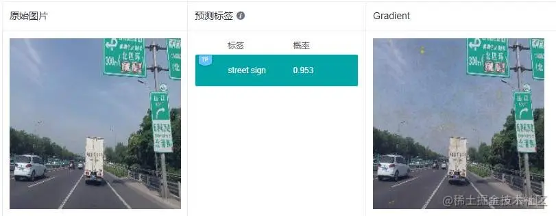 可以看到GradCAM的解释结果定位性和可理解性比较好,高亮区域集中在具体的特征上,用户可以通过高亮区域判断出和预测结果相关的特征。对于标签“路牌”,图像中的路牌被高亮,对于标签“飞机”,图像中的飞机被高亮,即GradCAM认为路牌区域和飞机区域是2个分类结果的主要依据。