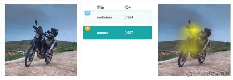 例7.3.3:这个例子中,有个预测标签是“person”,仔细看图中没有人。根据标签“person”的解释结果,高亮区域在摩托车的前部;在原图中,乍一看,还真像一个人趴着;猜测是分类模型推理的时候,误将这部分当做人了。
