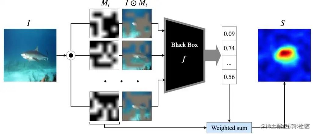·RISE,使用蒙特卡洛方法,对随机掩码进行加权(权重为遮掩后的模型的输出)平均得到最终显著图;