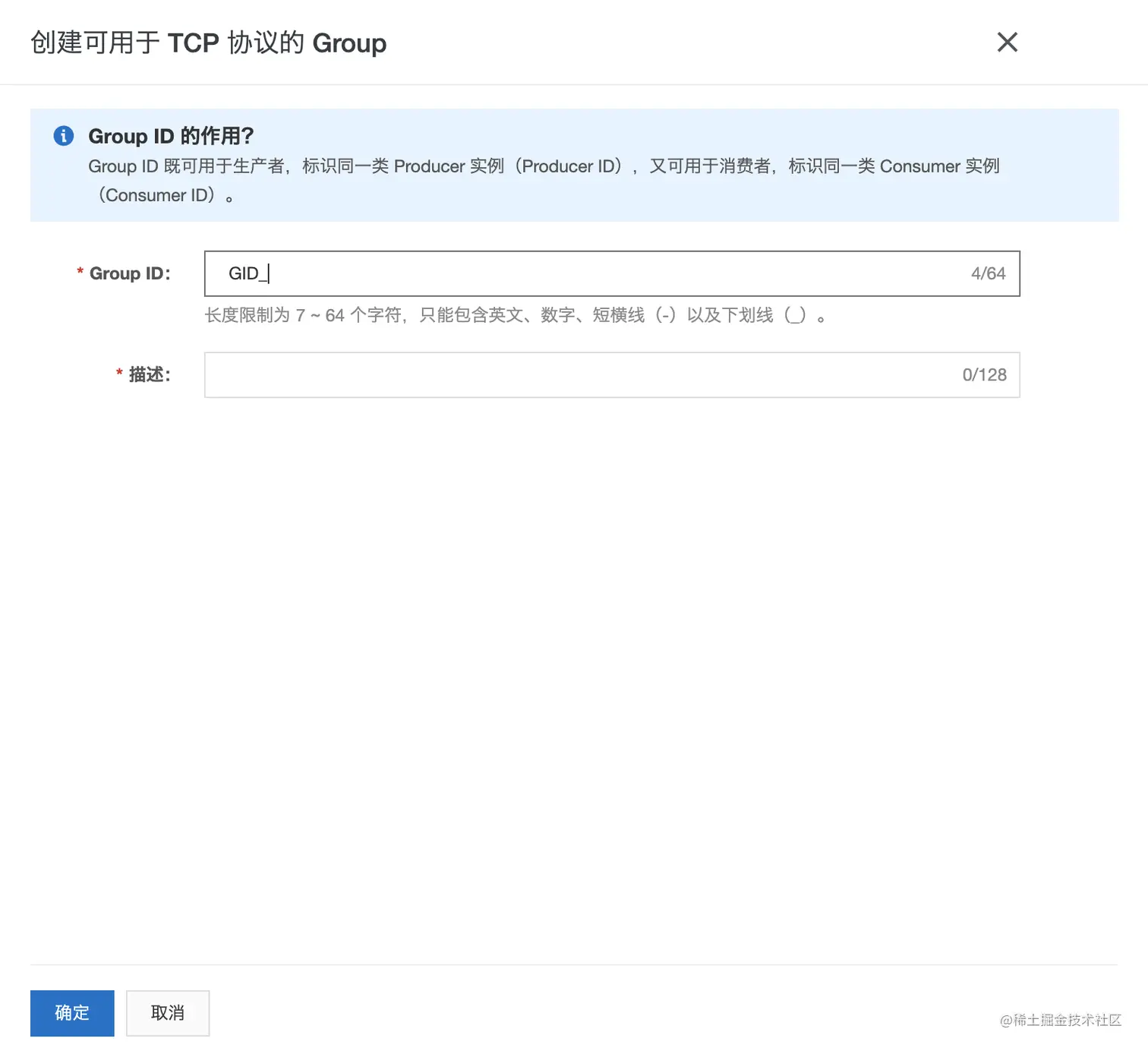 在创建可用于 TCP 协议的 Group面板,输入Group ID和描述,然后单击确定
