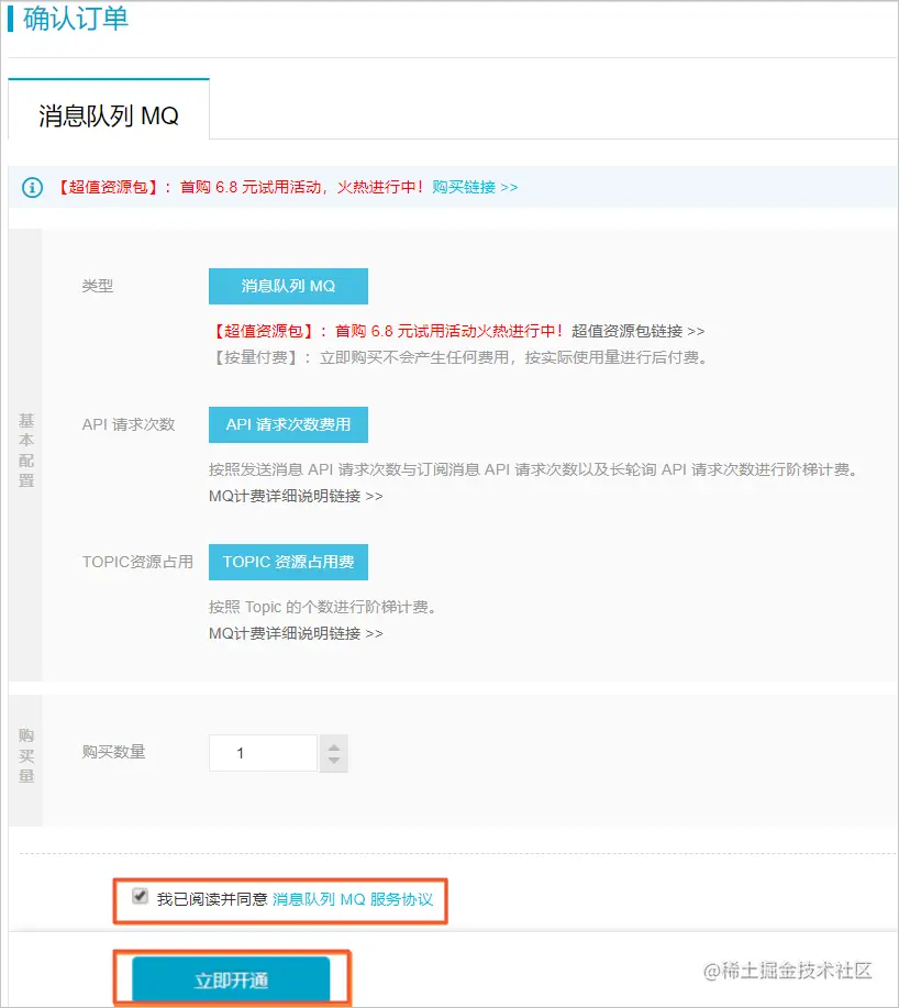 在确认订单页面,阅读订单内容以及服务协议后,选中我已阅读并同意消息队列 MQ 服务协议,然后单击立即开通。