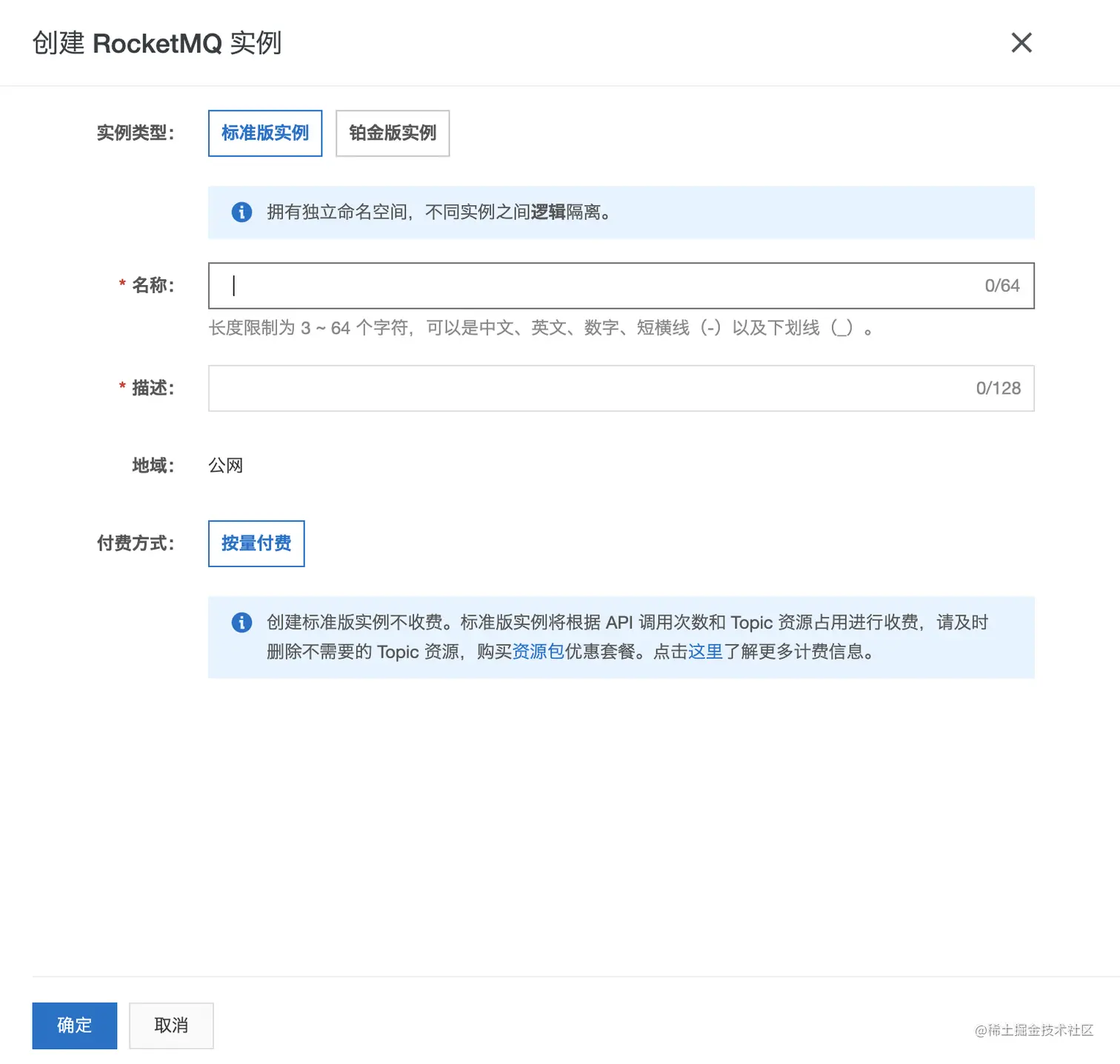 在创建 RocketMQ 实例面板,选择实例类型,并输入名称和描述,然后单击确定