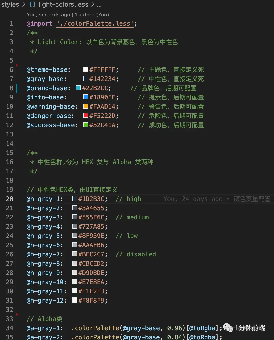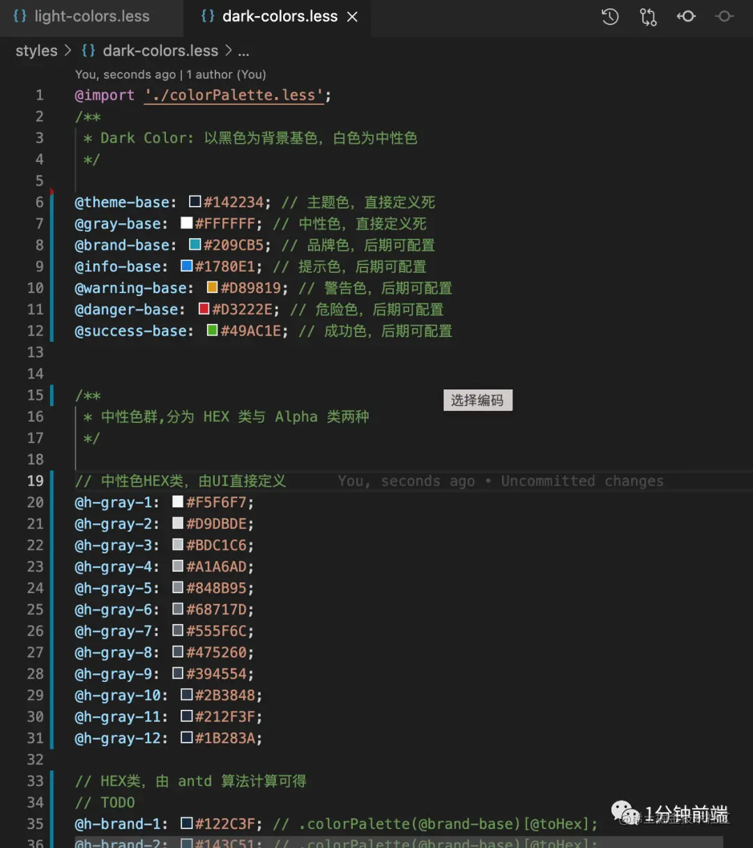 两种主题模式(light/dark),需要分别两个 less 文件来定义这两套颜色变量