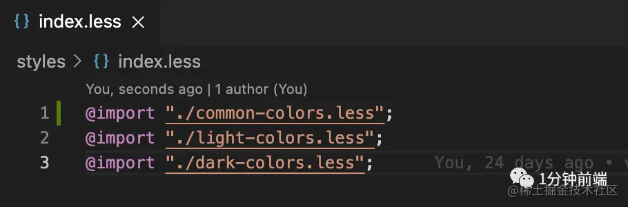 两种模式下,值固定不变的颜色变量单独定义一个文件 common-colors.less ,然后我选择将三个文件引入到同一个index 中输出使用,需要使用的地方只需要引入index.less 即可。