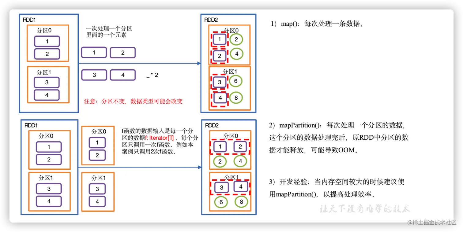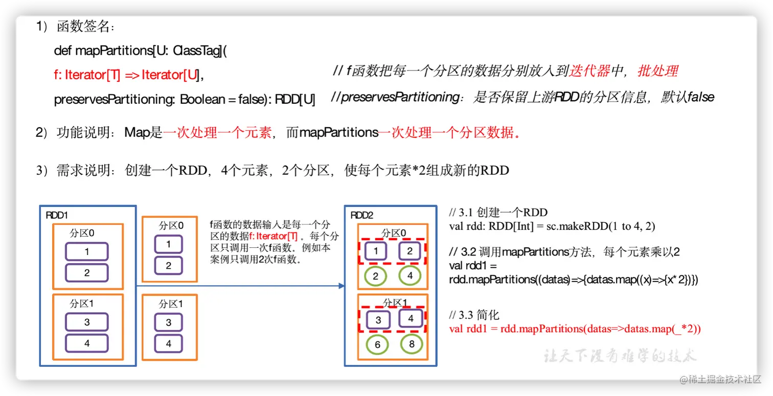 val rdd1 = rdd.mapPartitions(x=>x.map(_*2))