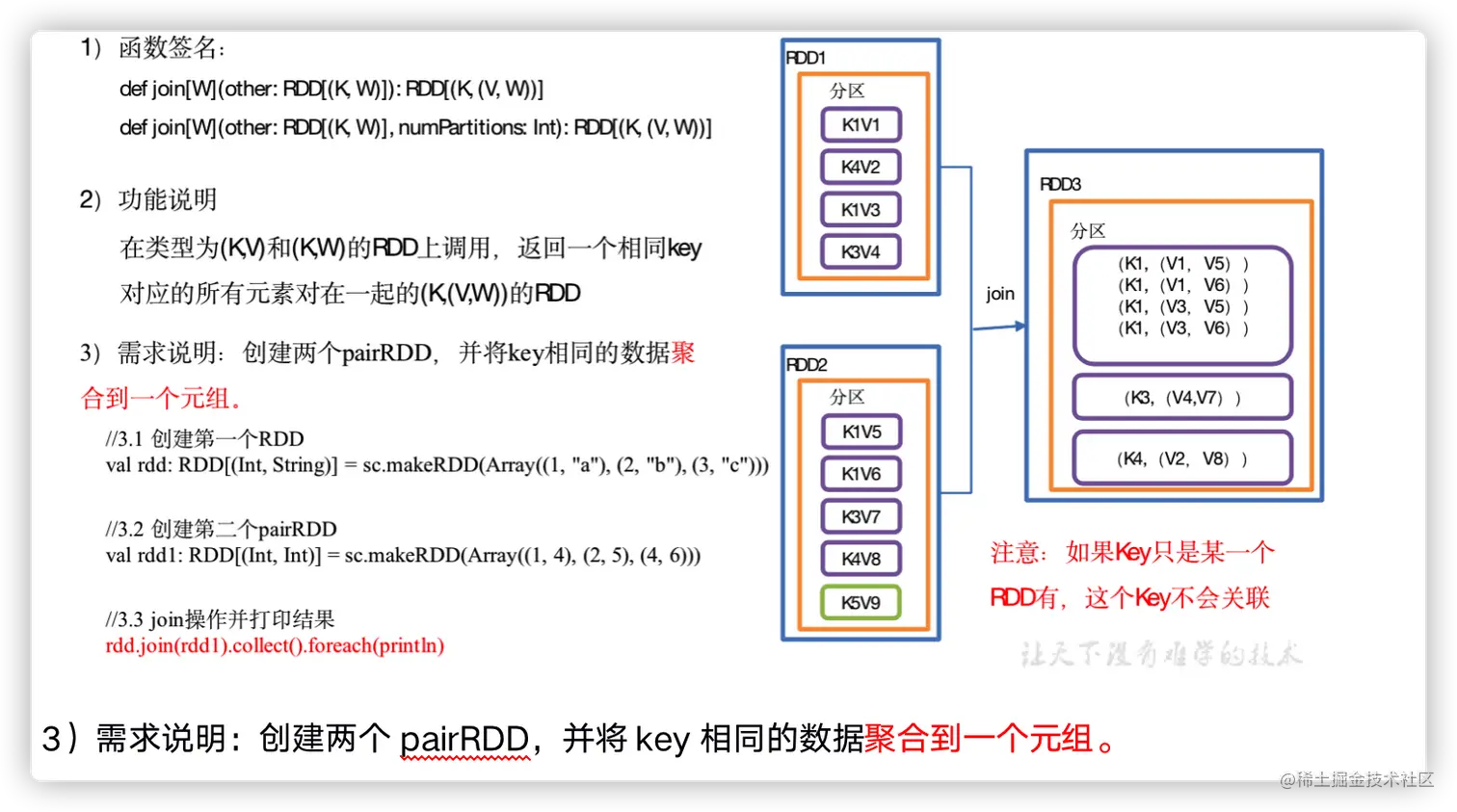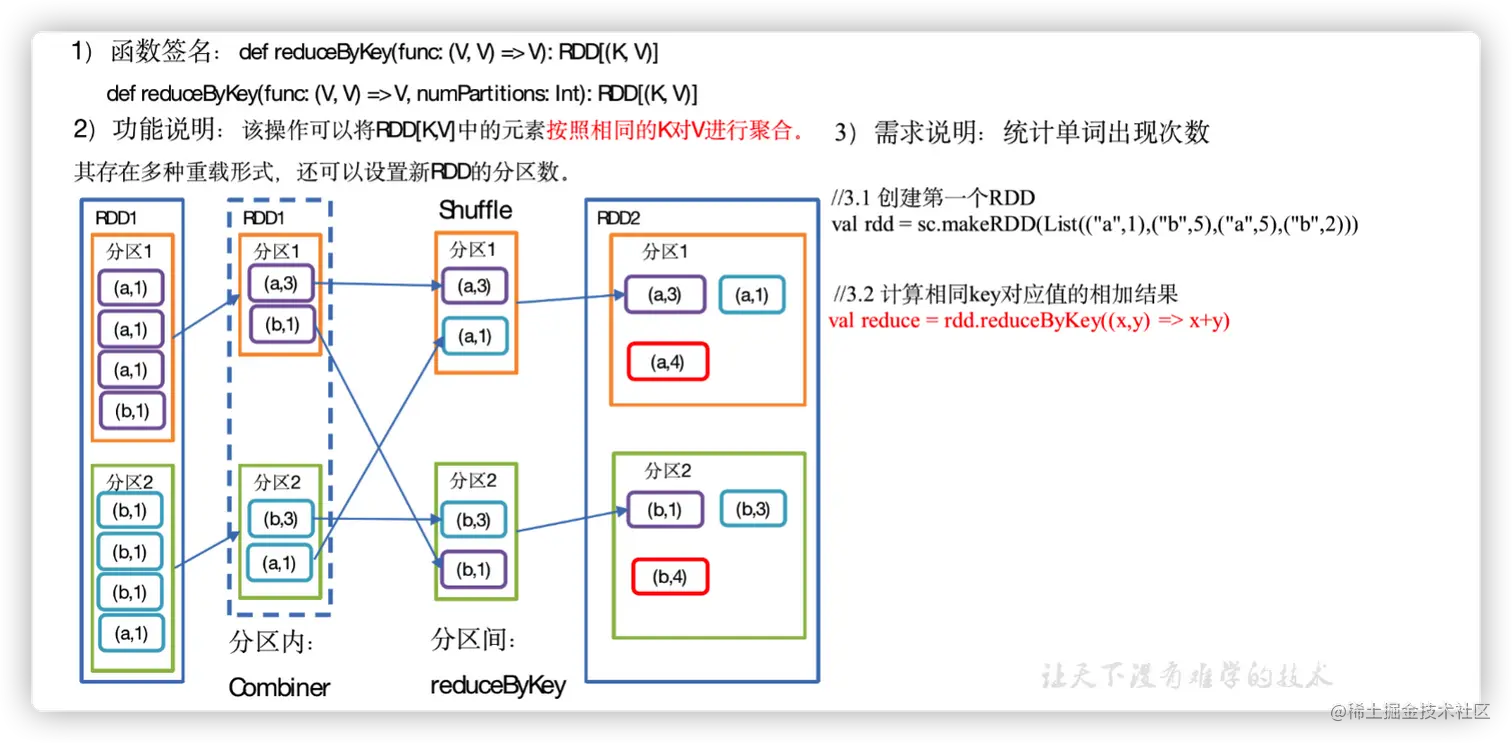 1)reduceByKey:按照key进行聚合,在shuffle之前有combine(预聚合)操作,返回结果是RDD[k,v]。