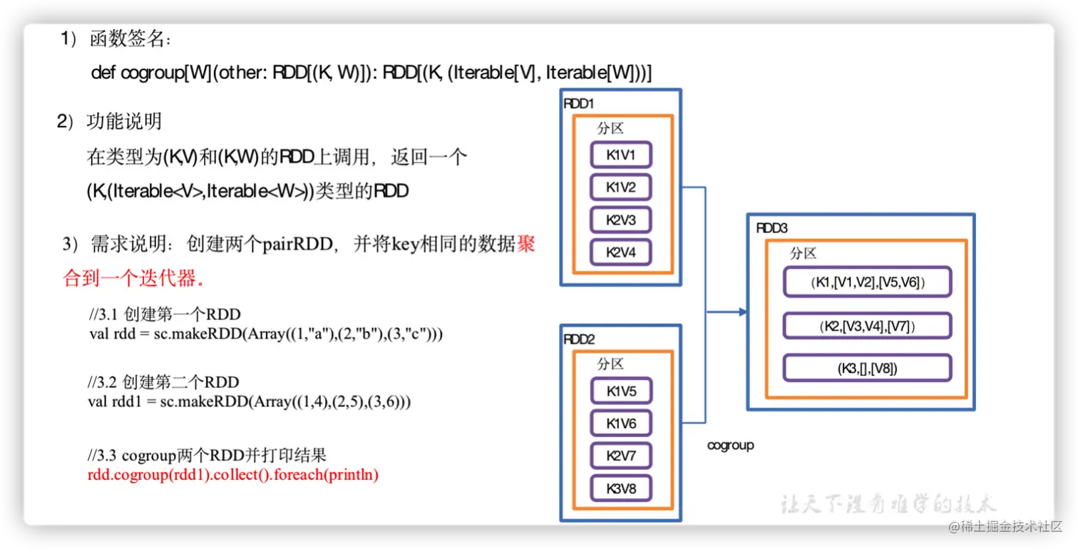 操作两个RDD中的KV元素,每个RDD中相同key中的元素分别聚合成一个集合