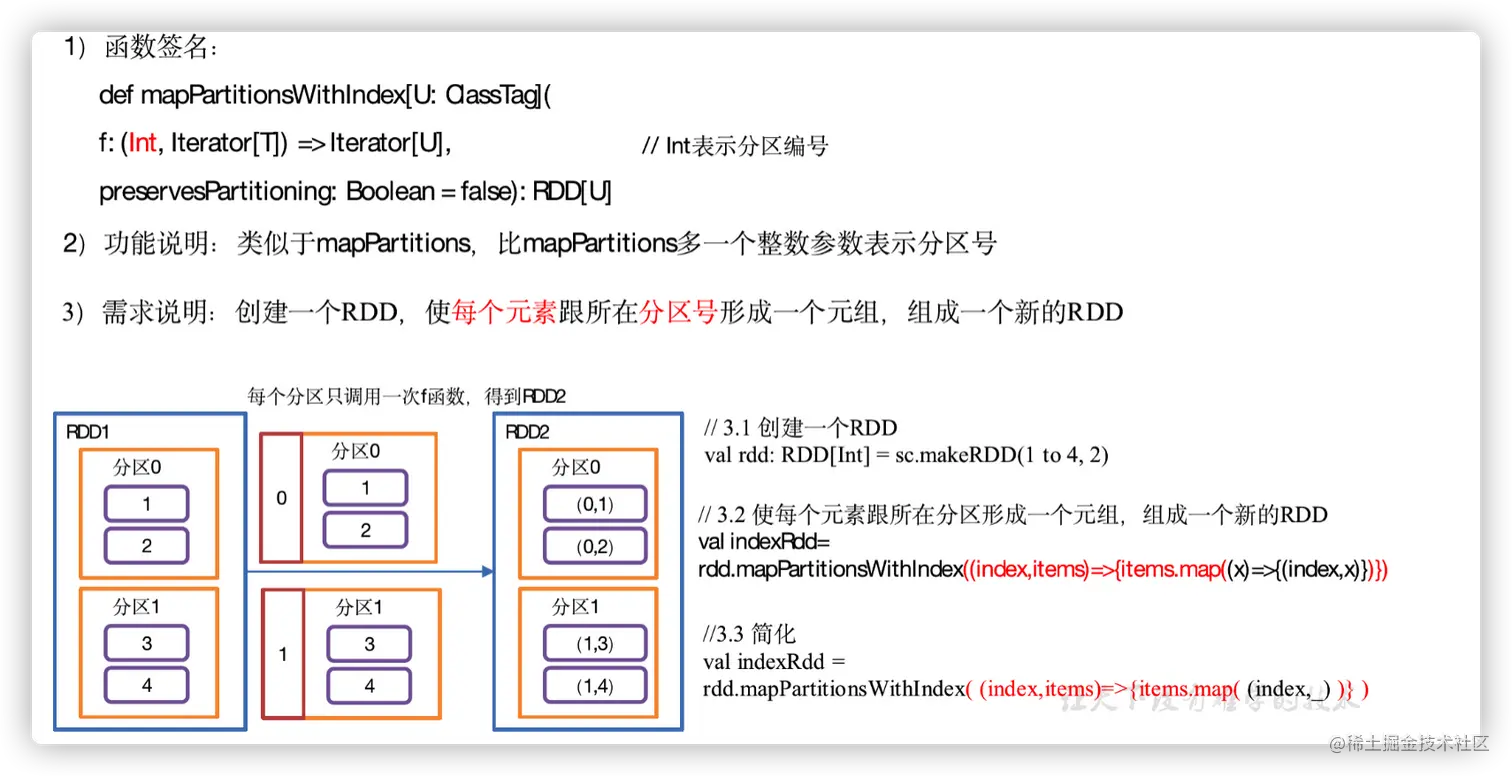 // 3.2 创建一个RDD,使每个元素跟所在分区号形成一个元组,组成一个新的RDD