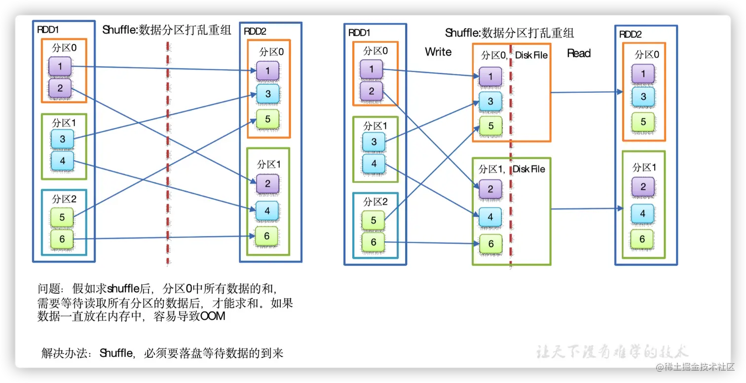 shuffle:将不同的分区数据打乱重组的过程,shuffle一定会落盘