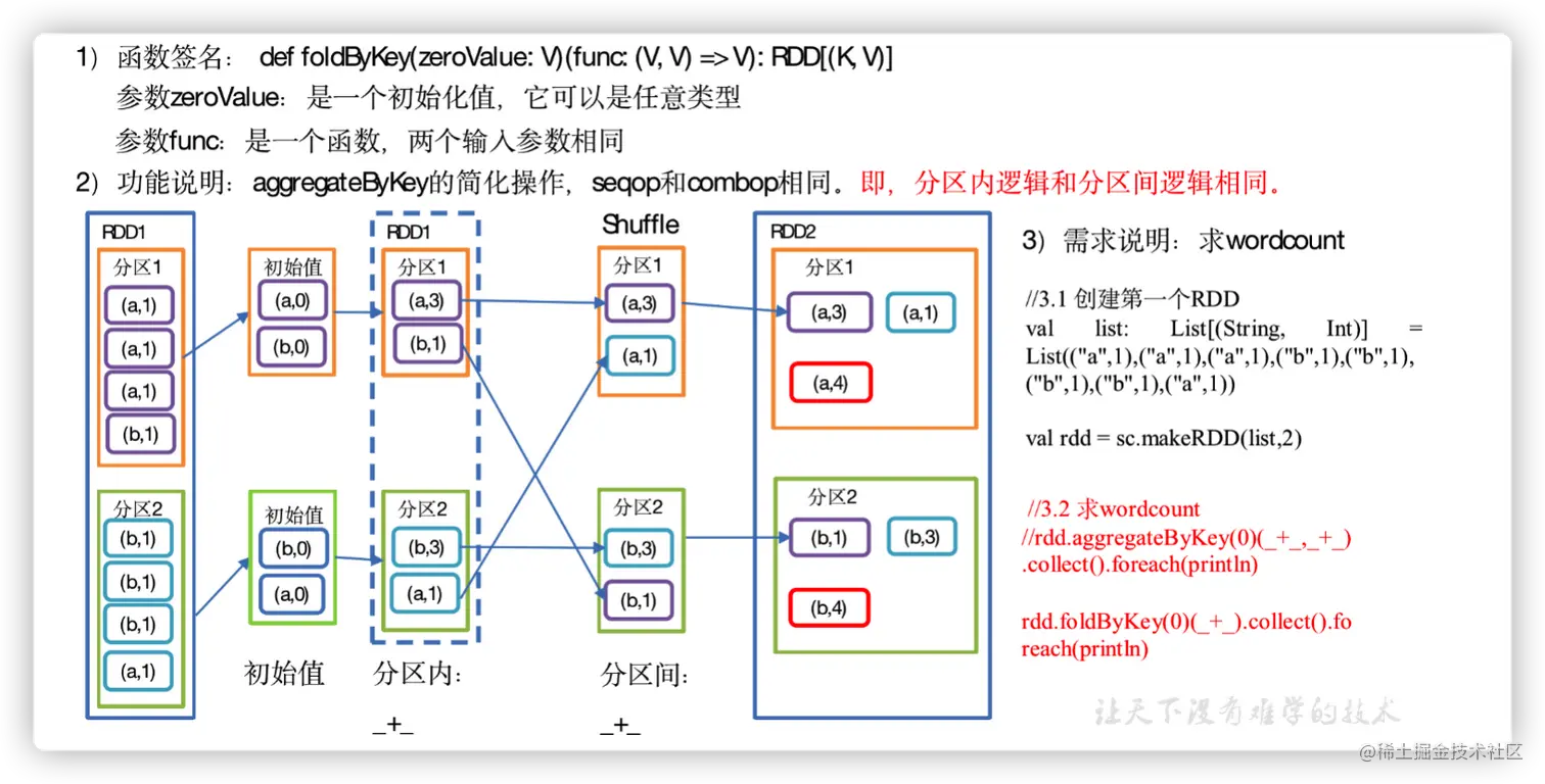 和aggregateByKey不同的是,它分区内与分区间的逻辑是相同的