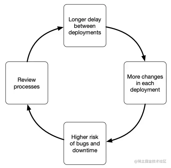 如下图所示,《发布!设计与部署稳定的分布式系统 第2版》提到:部署间隔时间有更长的延迟,将会导致每次的部署包含更多的代码变更,结果就是出现更多缺陷和宕机的风险,因此会增加更多的评审环节,那么又大大增加了部署之间的间隔时间。这是一个越来越差的增强回路。正如《发布》这本书所说的“如果每次部署都很痛苦,那么就频繁多次做”,所以高频的持续部署可以颠覆这个恶性循环,并且从以上国外大厂和国内大厂发布的频率来看,充分说明持续的部署是业务按需发布的必要条件。