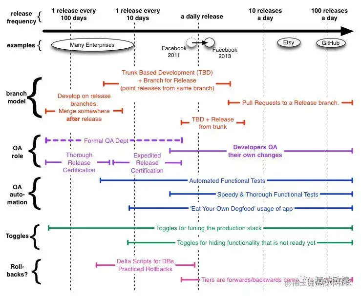 主干开发TBD(Trunk-Based Development)先锋保罗·哈曼特(Paul Hammant)将分支模型映射到发布频率,如下图所示,并且可以看到,特性开关作为一个必不可少的技术,可以很好的支持更频繁的发布。