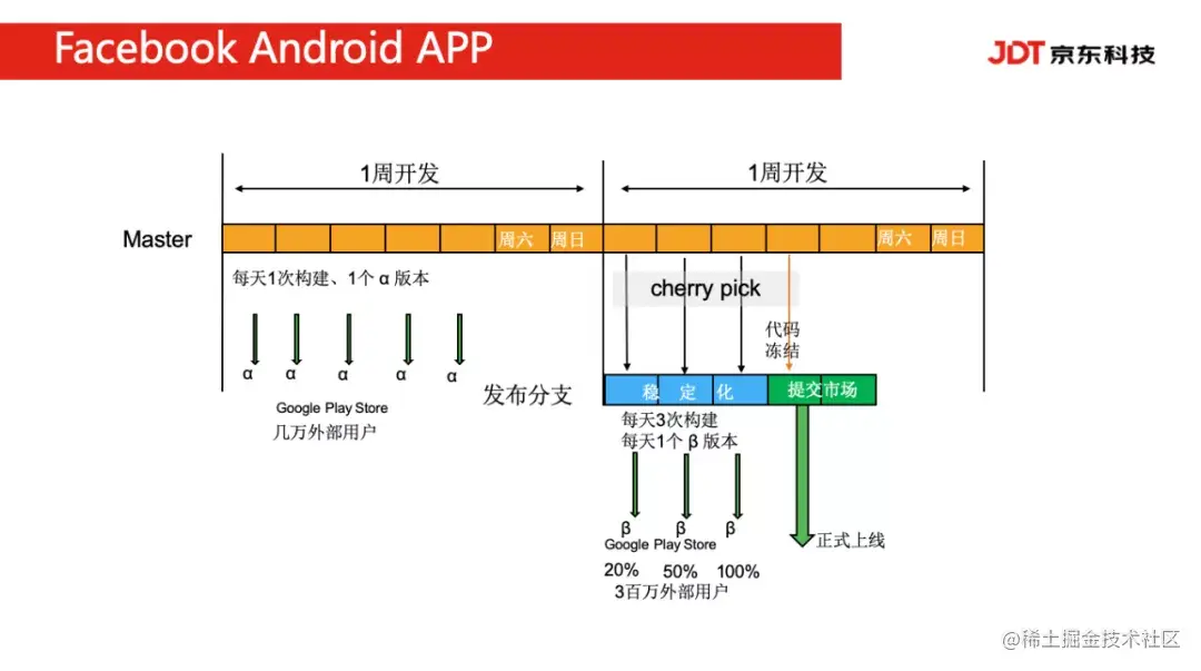 一周的开发中,在主干上每天进行1次构建,产生1个α版本,通过Google Play Store发布给几万个外部用户。在第一周周日下午6点创建发布分支,在第二周的前三天对前一周的开发进行稳定化和收尾,采用cherry pick将缺陷修复从主干上合并到发布分支上,同时每天进行3次构建,最终推出一个β版本,并通过Google Play Store发布给3百万外部用户,第一天覆盖20%用户,第二天覆盖50%用户,第三天覆盖100%用户;然后周四周五是Soak“渗透”阶段 ,周四冻结代码,处理问题,提交市场上线。