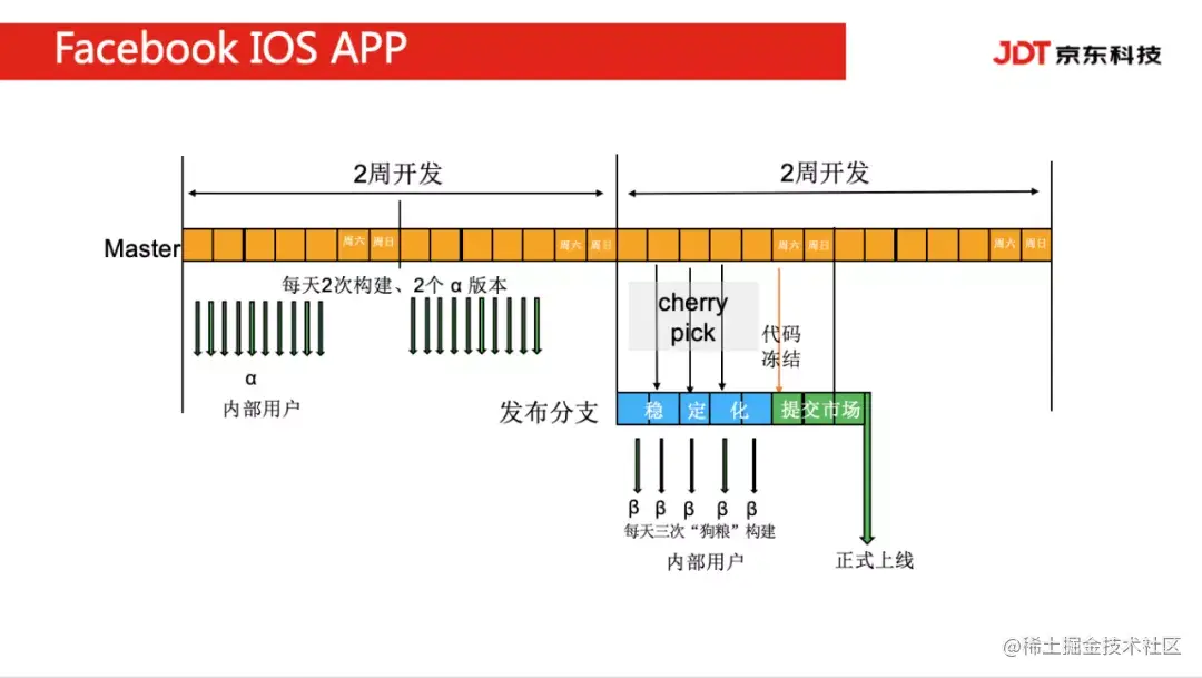 Facebook的苹果App采用了和安卓App同样的模式,但是时间被拉长了,是一个2+2的模式,2周开发测试,2周的灰度和提交市场。