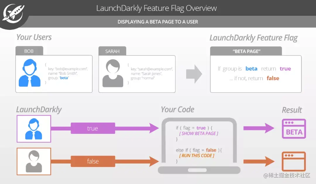 当开关关闭的时候,实际上体现的就是部署,将新版本部署到生产环境的时候,用户不可见,当打开开关的时候,功能对用户可见。所以特性开关很好的支持了将部署和发布解耦。