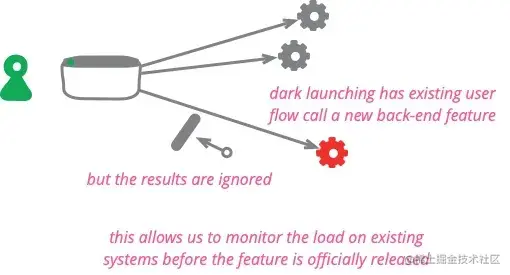 如下图黑启动的本意所示,马丁·福勒(Martin Fowler)在黑启动文章提到,黑启动针对的是后端行为,后端系统部署在生产环境之后,现有用户使用前端界面的时候,新部署的后端功能被调用,但是用户并没有感知,可以对新功能的性能进行监控。也就是说用户和系统的交互逻辑保持不变,用户在界面上没有地方选择新部署的功能,也就是对用户不可见。