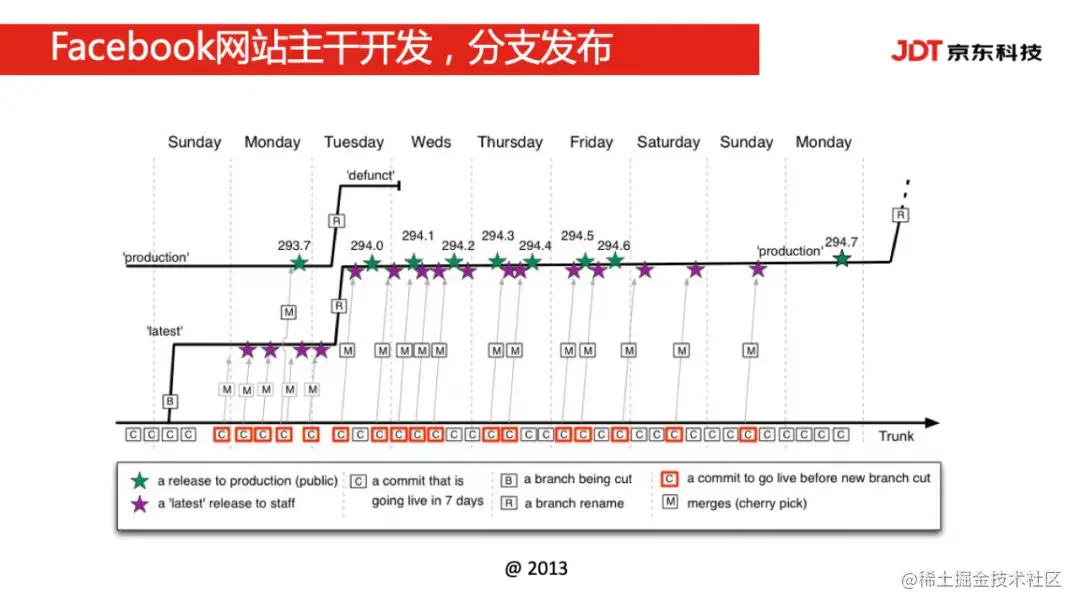 新版本是从主干Trunk上开一个分支,名为为latest,代表着最新的发布分支,包含着上周就绪但没有cherry pick摘取到上一个版本代码,即最新的代码代表着所有的代码,一部分代码已经在上个版本发布,一部分是未发布但是就绪完成的代码,然后在周二的时候,因为上一个版本发布分支的名字已经从production改为defunct, prodution名字被释放,就可以将latest分支重新命名为produciton。总结下,这个发布分支从上周日到周一的时候叫做latest分支,周二到下周一的时候叫做production分支,无论如何改名字,都代表着发布分支,在下面的描述汇中我们统一称之为发布分支。