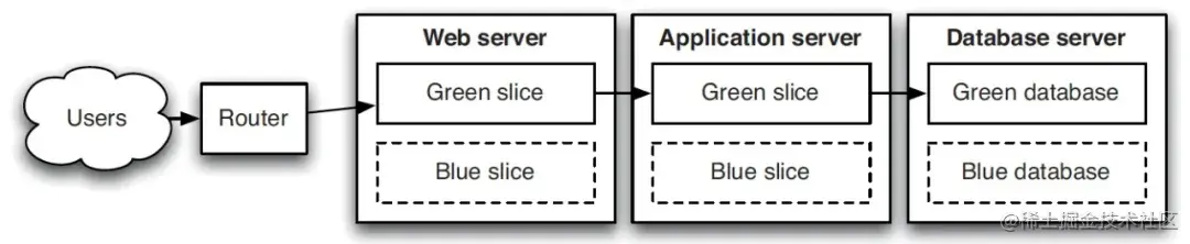 如果由于成本和投资回报的考虑,不能建设两套完全一样的生产环境,那么可以将蓝环境作为预发或预生产环境,将软件的新版本部署在预发环境,并进行验收测试,之后将访问流量引流到这个预发环境,那么蓝环境就是正式的生产环境,同时保持旧版本所在的绿环境不变,直至新版本没有问题后,再将旧版本所运行的环境作为下一个新版本的预发环境。