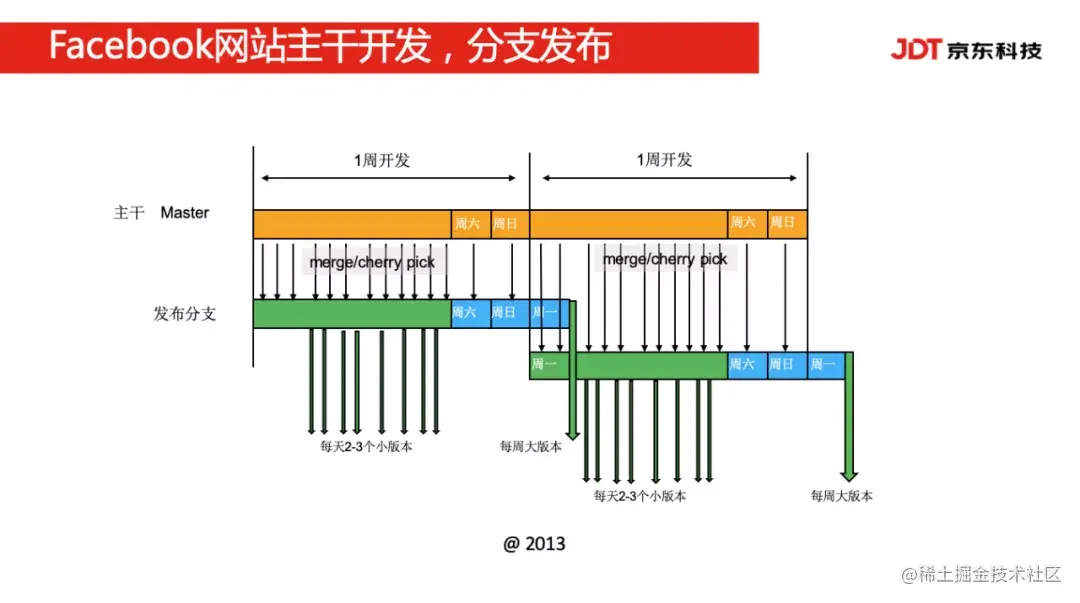 Facebook网站2003-2017年的分支策略,采用主干开发(Trunk/Master),分支发布(Production/Release)。如下图所示意,每天2-3个小版本,每周一个大版本。